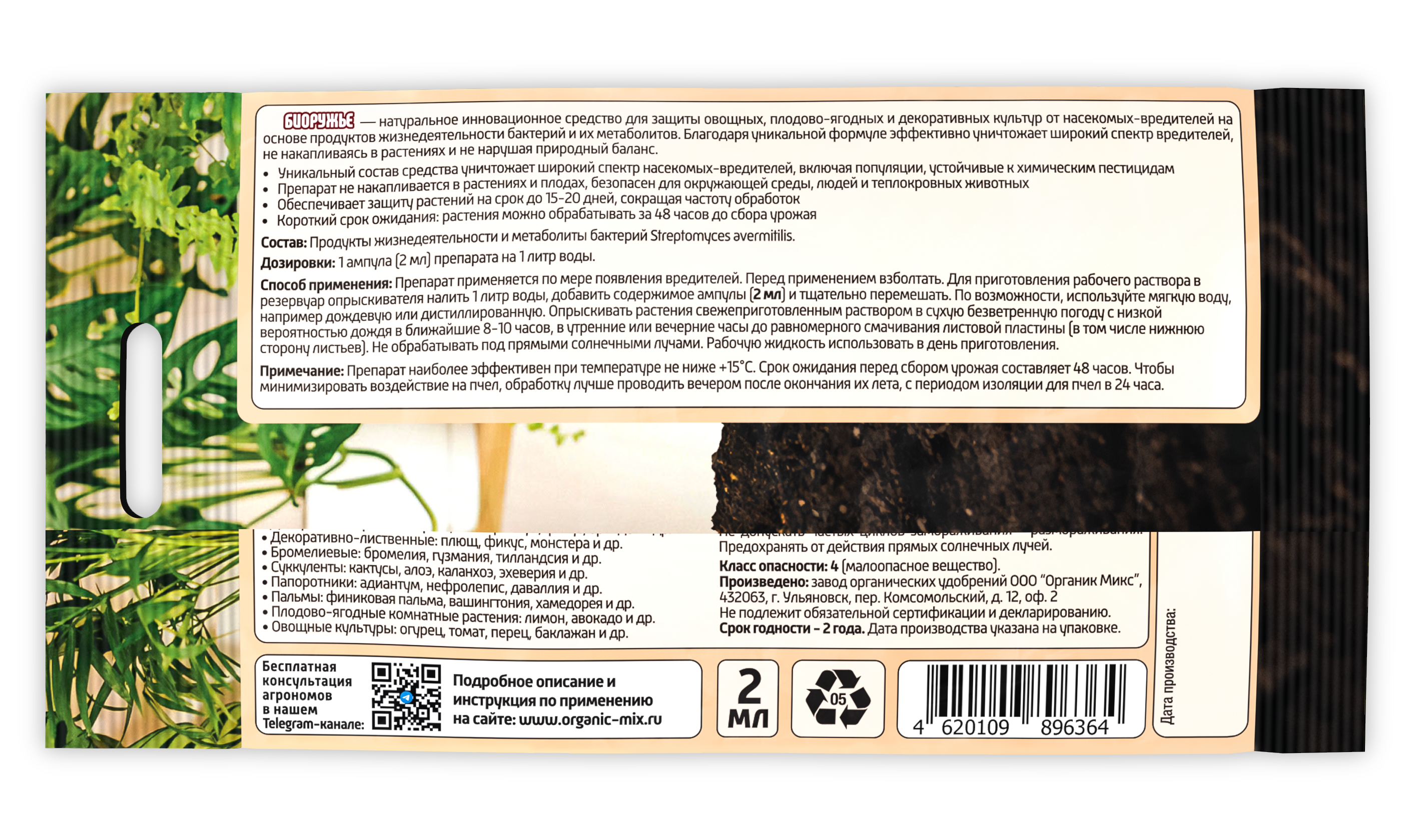 Биоружье — натуральное инновационное средство для защиты овощных, плодово-ягодных и декоративных культур от насекомых-вредителей на основе продуктов жизнедеятельности бактерий и их метаболитов. Благодаря уникальной формуле эффективно уничтожает широкий спектр вредителей, не накапливаясь в растениях и не нарушая природный баланс.