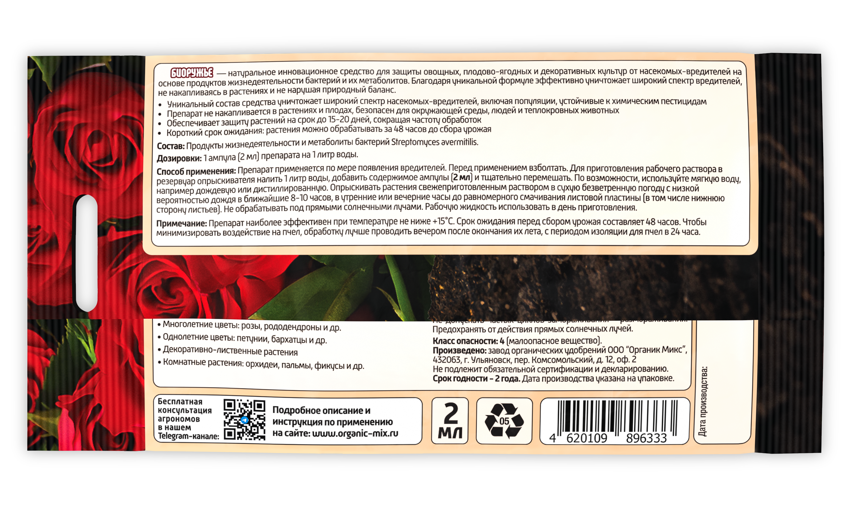 Биоружье — натуральное инновационное средство для защиты овощных, плодово-ягодных и декоративных культур от насекомых-вредителей на основе продуктов жизнедеятельности бактерий и их метаболитов. Благодаря уникальной формуле эффективно уничтожает широкий спектр вредителей, не накапливаясь в растениях и не нарушая природный баланс.