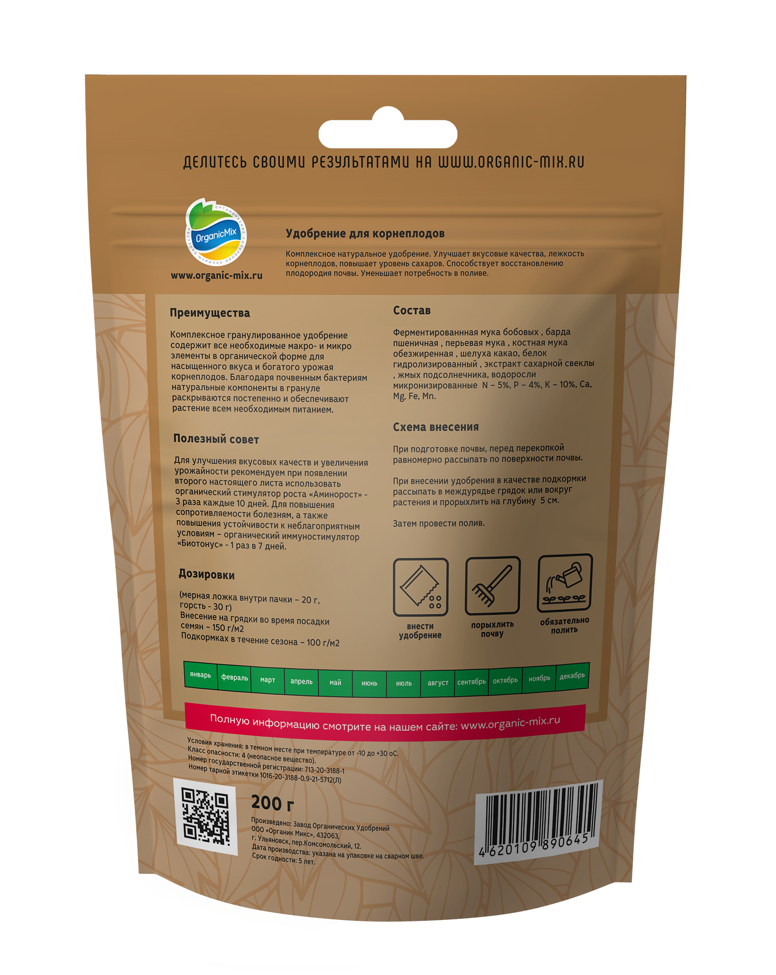 Комплексное гранулированное органическое удобрение пролонгированного действия, которое содержит все необходимые макро и микроэлементы в органической форме для насыщенного вкуса и богатого урожая корнеплодов.