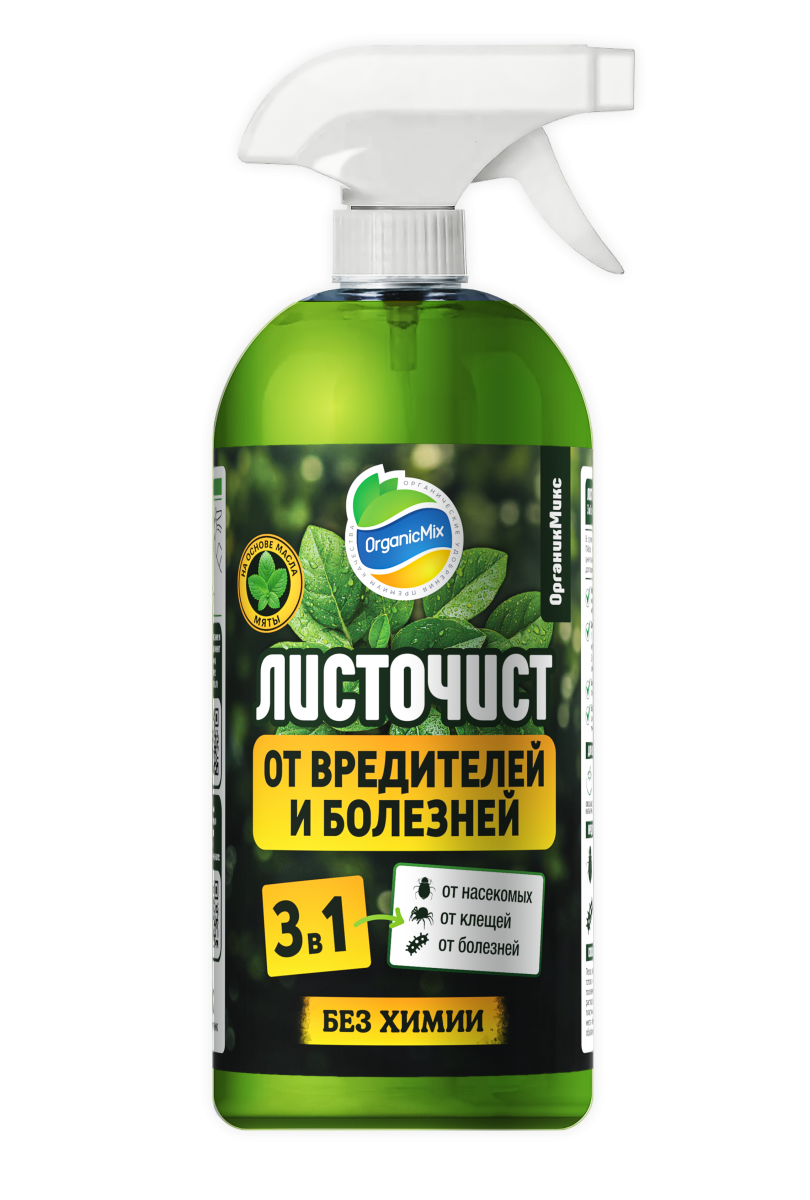 Листочист – органическое средство защиты растений 3 в 1: от вредителей, болезней и клещей. В основе – эфирное масло мяты и композиция натуральных ПАВов, которые обеспечивают комплексное воздействие: уничтожают вредителей, подавляют развитие болезней и создают долговременную защиту растений.