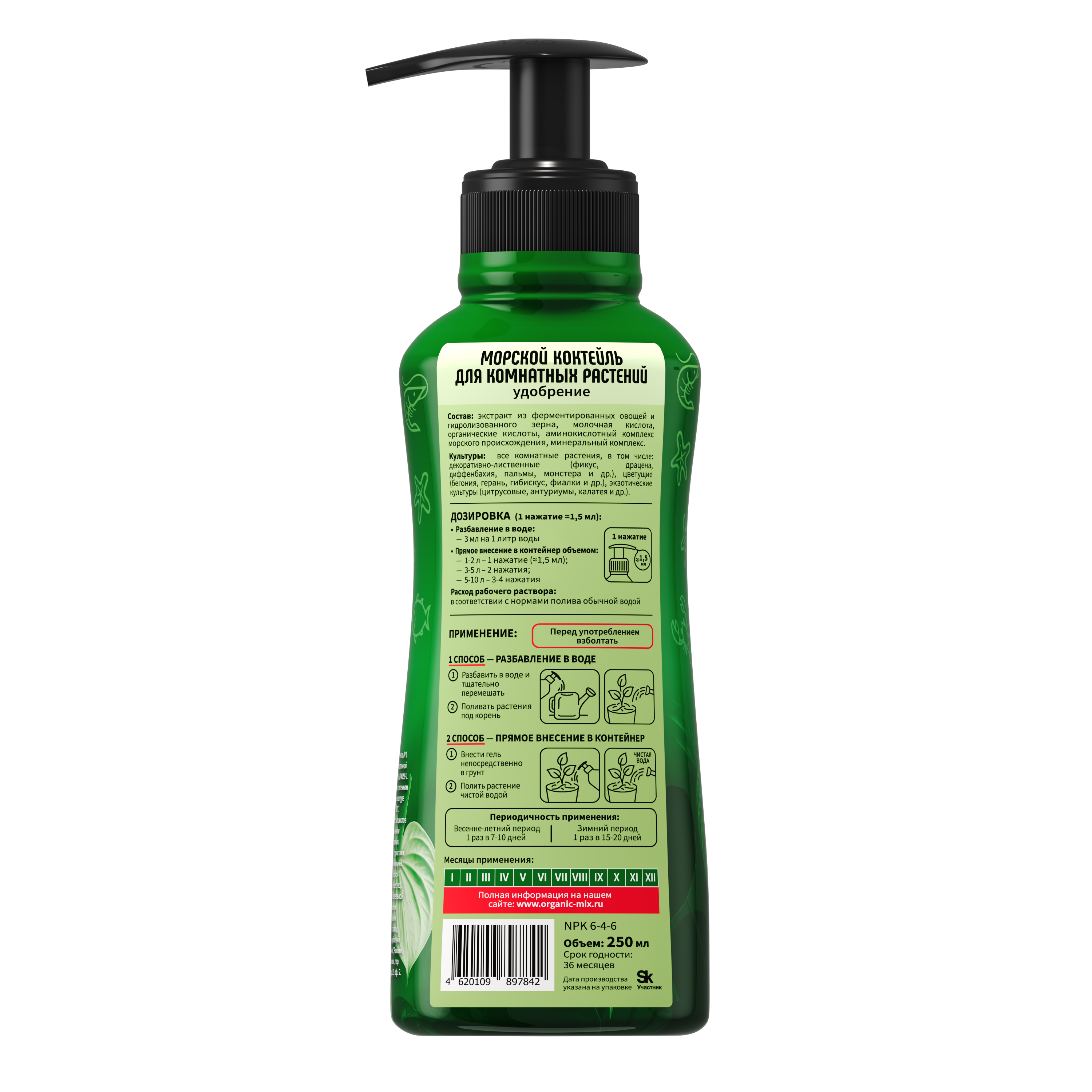 Морской коктейль обеспечивает полноценное питание комнатных растений в условиях ограниченного объёма грунта. Препарат улучшает корневое питание, активизирует обмен веществ и способствует формированию здоровой листовой массы.