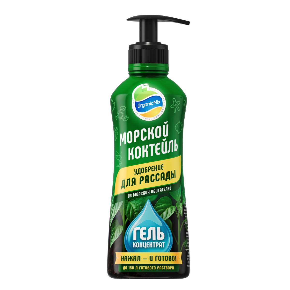 Морской коктейль (гель) для рассады — профессиональное удобрение нового поколения на основе биоактивных веществ морского происхождения для комплексного питания рассады всех культур. Содержит аминокислоты, пептиды и микроэлементы, что обеспечивает устойчивый рост, формирование сильной корневой системы и повышение стрессоустойчивости растений.
