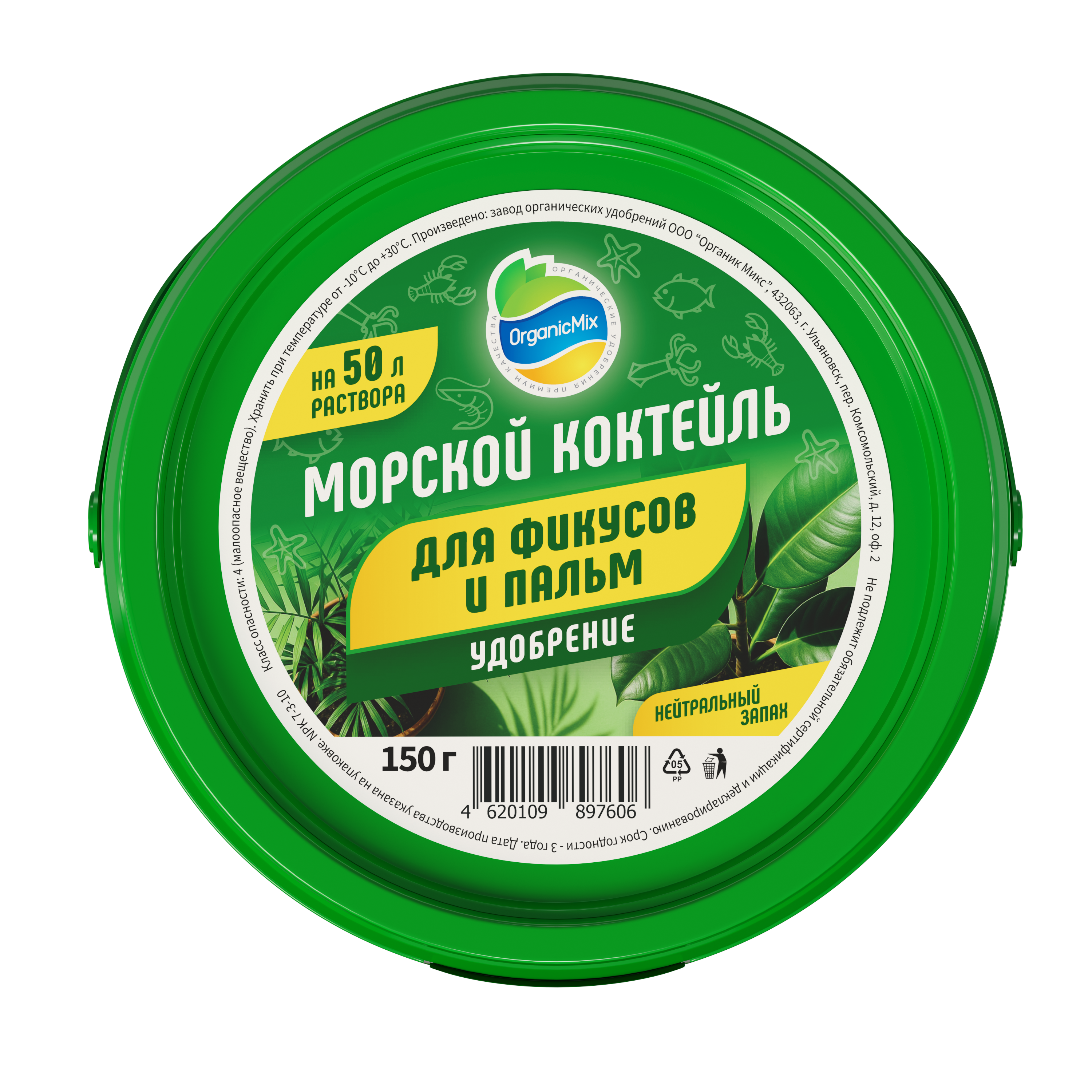 Морской коктейль (водорастворимый) для фикусов и пальм – это специализированное комплексное водорастворимое удобрение нового поколения на основе автолизата морских обитателей. Оно создано для полноценного питания декоративно-лиственных культур с крупными листьями и мощной кроной. Регулярное применение обеспечивает гармоничный рост, формирование густой листвы и поддерживает естественную декоративность фикусов, пальм и других экзотических растений, выращиваемых в горшках, кадках и контейнерах.