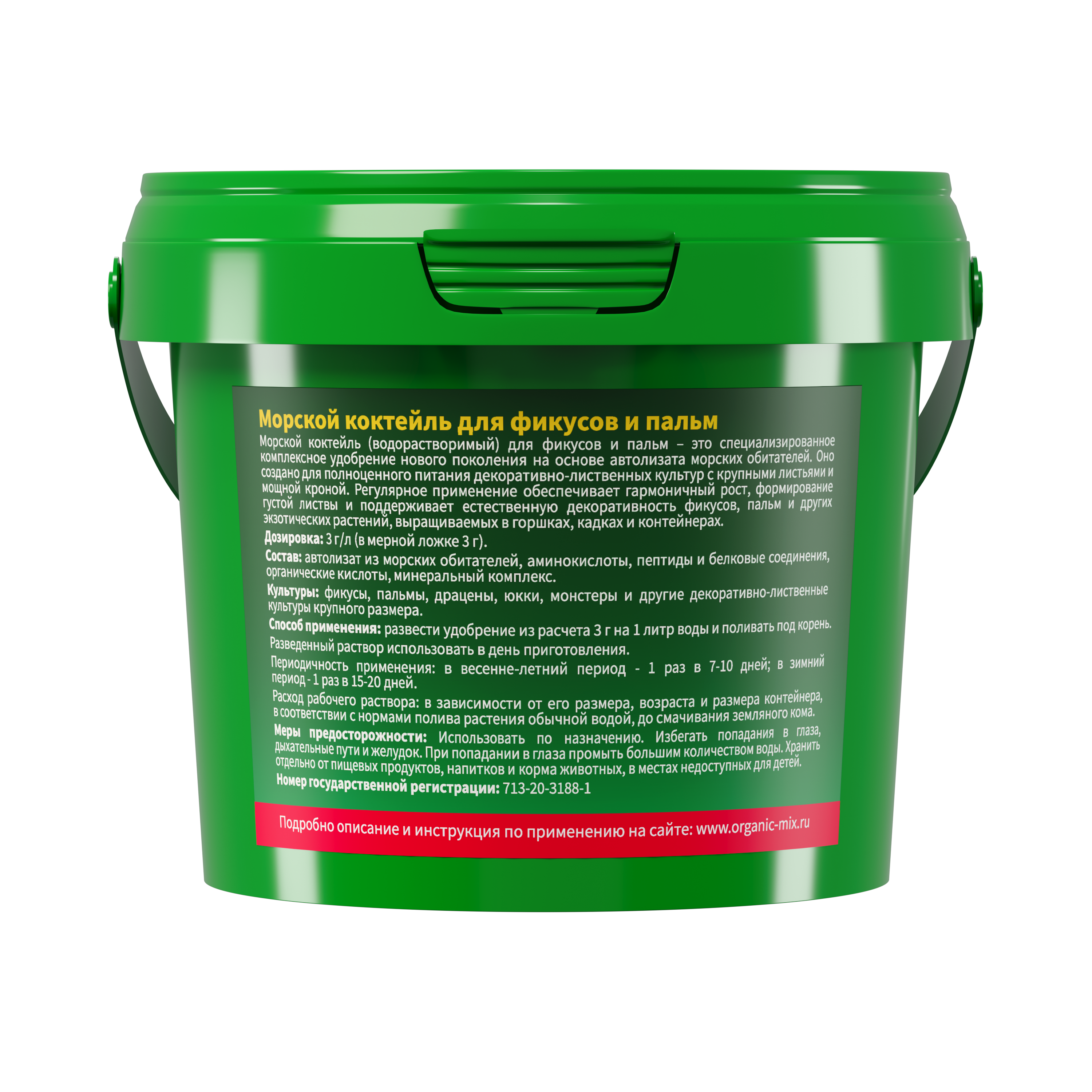 Морской коктейль (водорастворимый) для фикусов и пальм работает на клеточном, тканевом и системном уровнях, обеспечивая полноценное питание, активный рост и высокую декоративность крупных декоративно-лиственных растений в горшках и кадках.