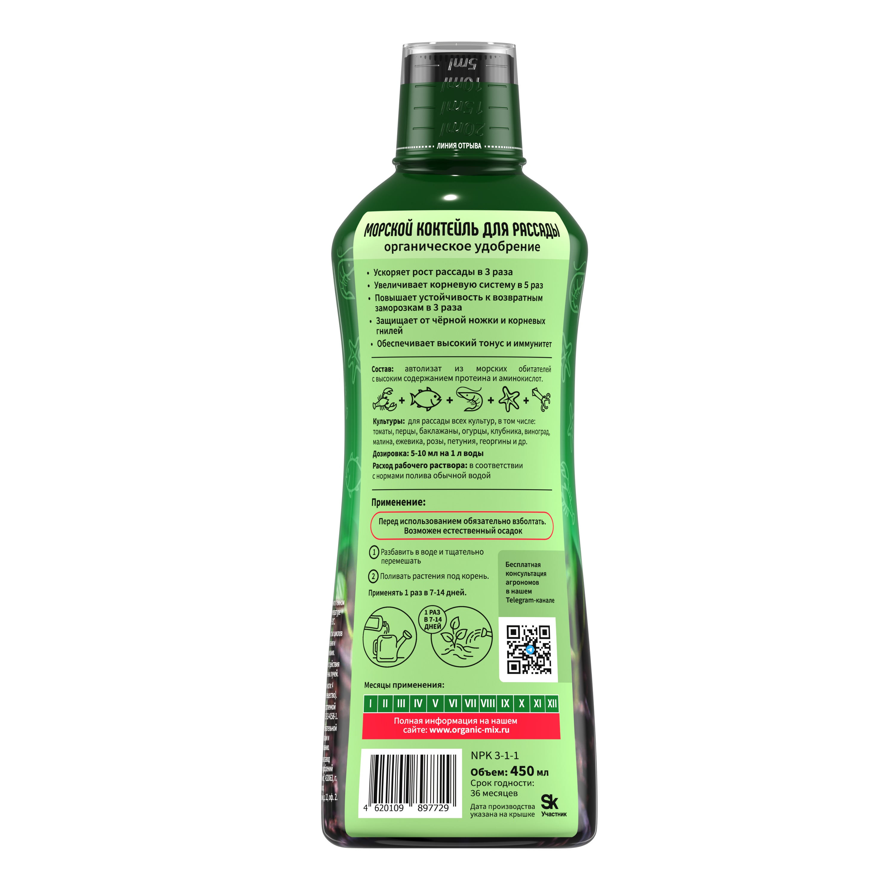 Морской коктейль - это инновационное органическое питание для растений, обеспечивающее их мощнейший рост и развитие, увеличение количества ветвей и толщины стебля, насыщенный зеленый цвет листьев, увеличение количества и размера цветоносов, соцветий и бутонов, повышение урожайности и содержания витаминов и антиоксидантов в плодах.
