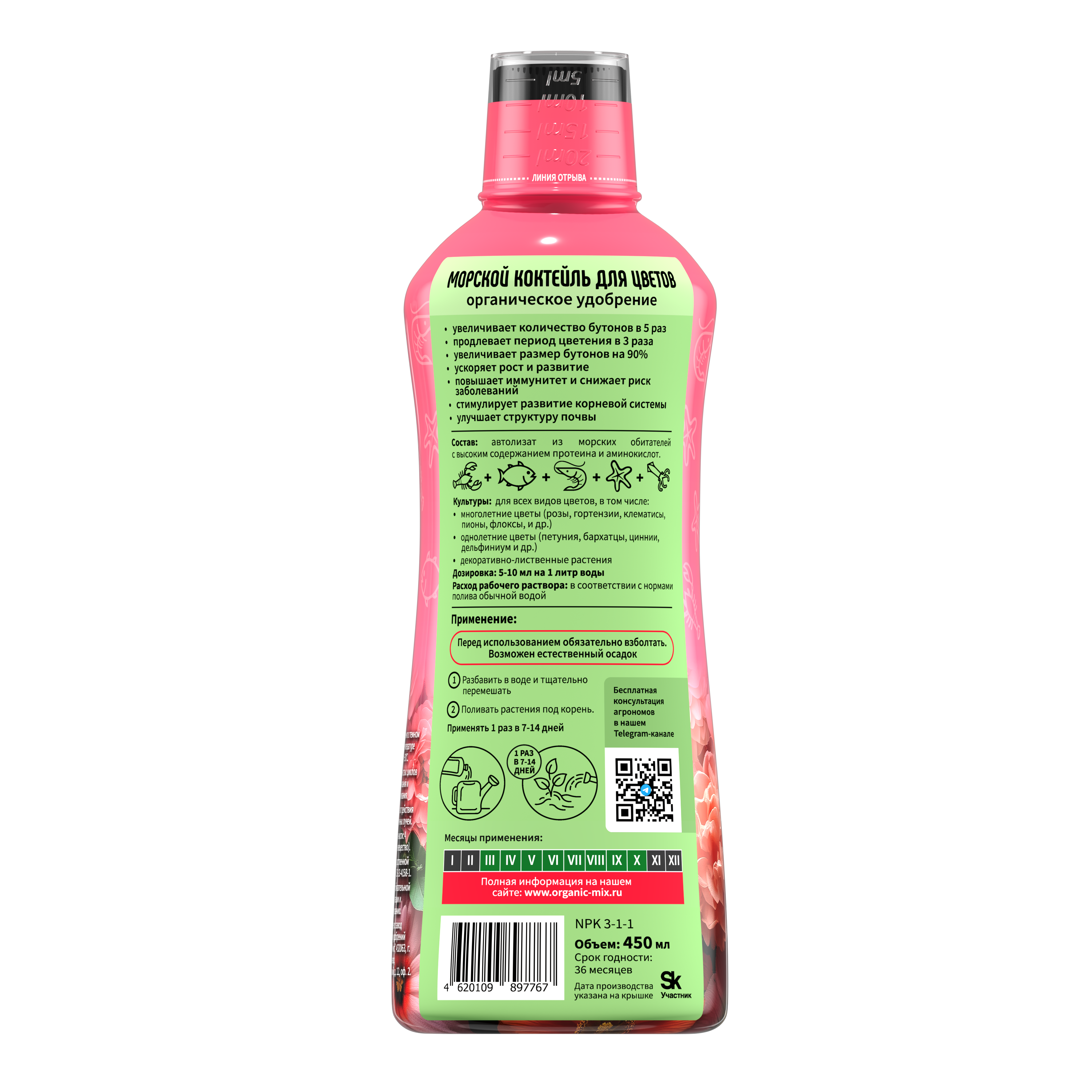 Морской коктейль - это инновационное органическое питание для растений, обеспечивающее бурный рост и развитие, увеличение количества ветвей и толщины стебля, насыщенный зеленый цвет листьев, увеличение количества и размера цветоносов, соцветий и бутонов.
