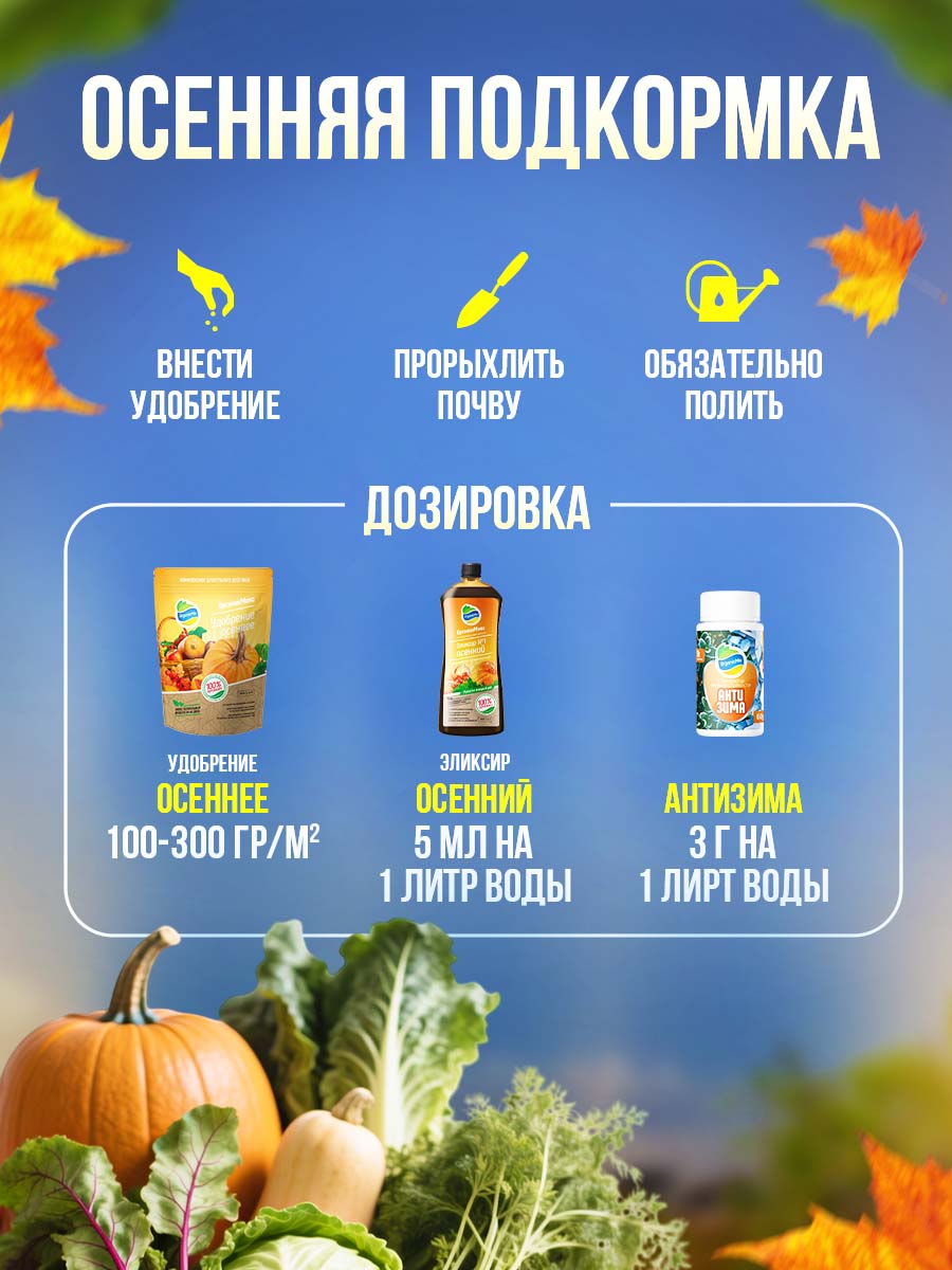 Удобрение осеннее - комплексное органическое удобрение для обеспечения растений необходимыми питательными элементами для подготовки грядки к следующему сезону и подкормки многолетних культур осенью.