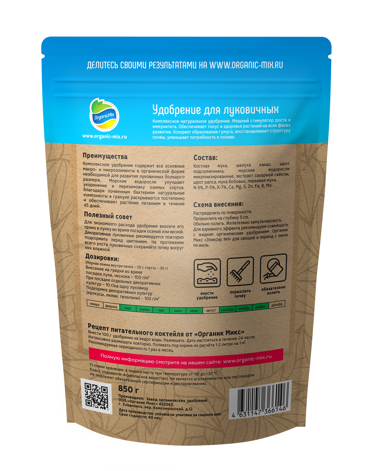 Для взрывного эффекта рекомендуется совмещать с жидким органическим удобрением Органик Микс «Эликсир №1» для овощей с июня по июль